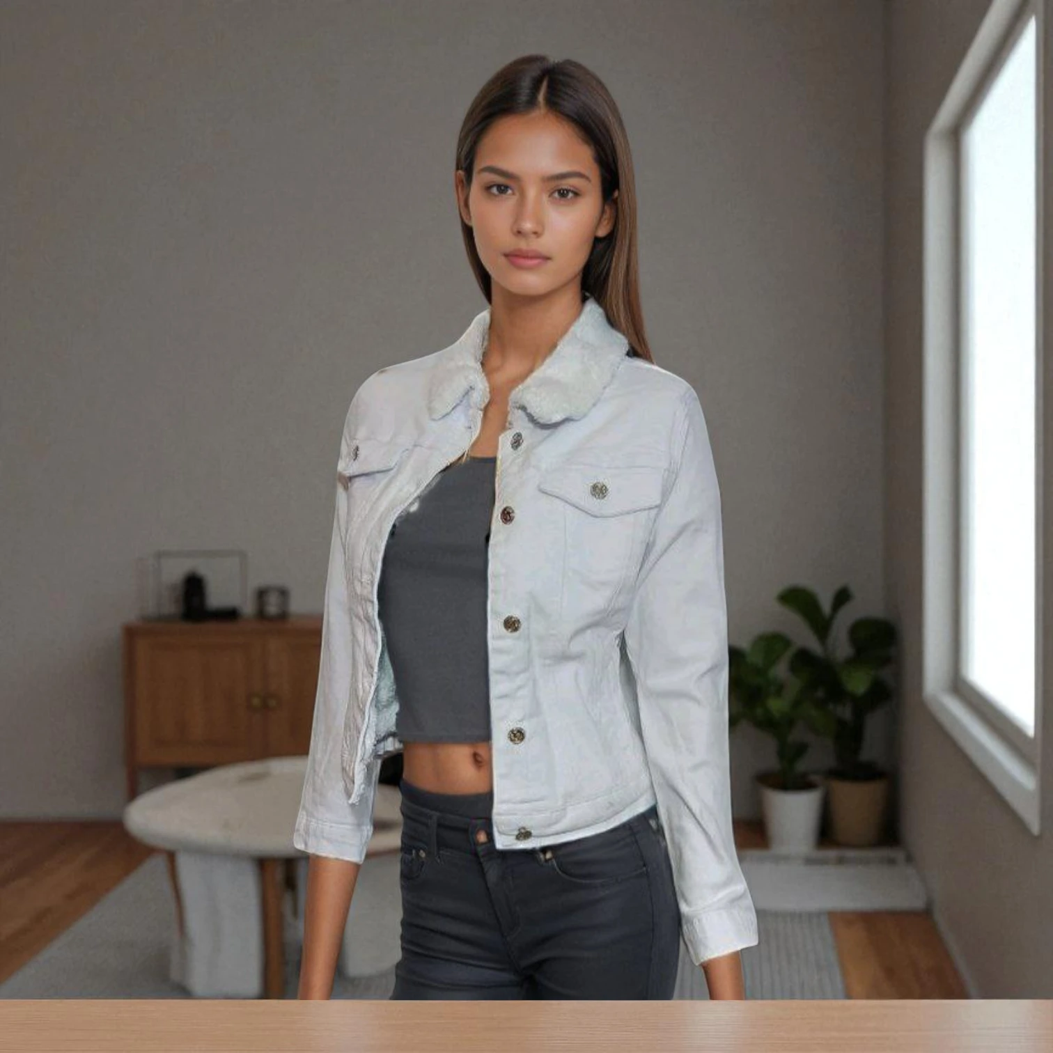 Chamarra de mezclilla en color blanco con acabado suave y moderno. Su diseño entallado resalta la figura y aporta un estilo versátil para combinar con cualquier look casual o semi-formal. Cuenta con botones metálicos al frente, bolsillos decorativos en la parte superior y un cuello con forro tipo borrega que brinda un toque cálido y sofisticado. Ideal para usar en climas frescos, ya sea con jeans, leggins o vestidos, dándole un aire juvenil y urbano a tu outfit.