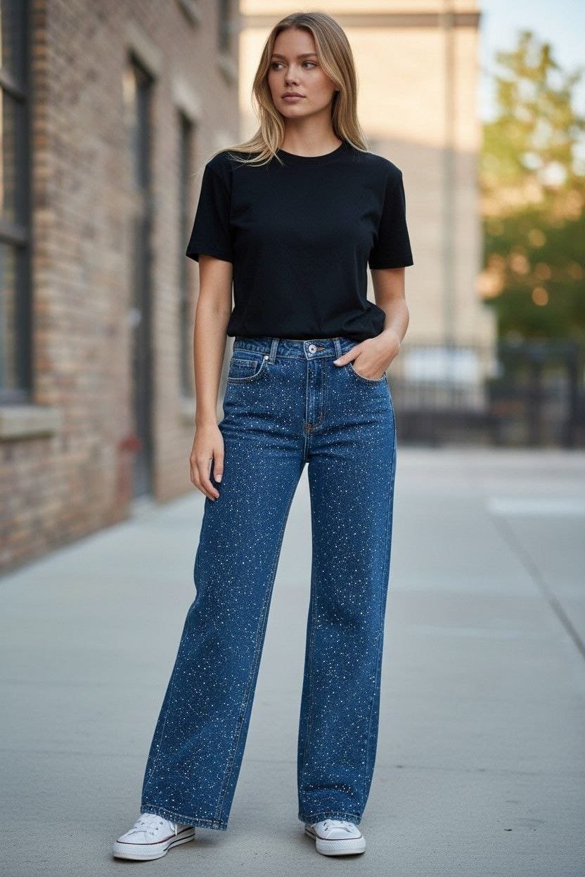 Lleva el brillo a otro nivel con estos jeans diseñados para robar miradas. Mientras que el frente mantiene una estética limpia y moderna, la parte posterior está completamente recubierta de pedrería plata, creando un efecto de «cascada de diamantes» con cada movimiento. El corte baggy aporta esa actitud relajada que contrasta perfectamente con el lujo de los cristales.
