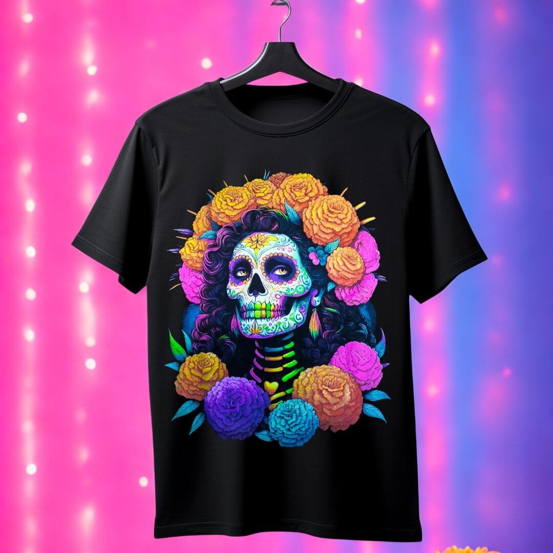 Lo que realmente distingue a esta playera es su capacidad para resplandecer bajo luz neón o negra, convirtiéndola en la prenda ideal para fiestas, conciertos o eventos nocturnos. Cuando la luz adecuada la ilumina, el diseño cobra vida, atrayendo todas las miradas y destacándote en cualquier ambiente. Su estilo único no solo es un homenaje a la cultura mexicana, sino también una apuesta por prendas innovadoras que van más allá de lo convencional.