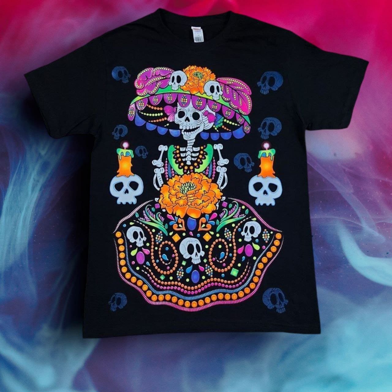 Ir a la TiendaIncreíbles playeras Unisex con Serigrafía Neón de cráneos temáticos. Ideales para festejar día de muertos con tus seres queridos.