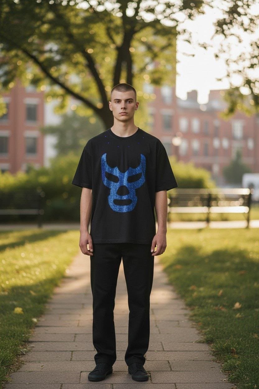 No es solo una playera, es un homenaje a la cultura más vibrante de México. Nuestra playera de Luchador Mexicano reinventa el misticismo de la máscara con un acabado deslumbrante en pedrería fina.