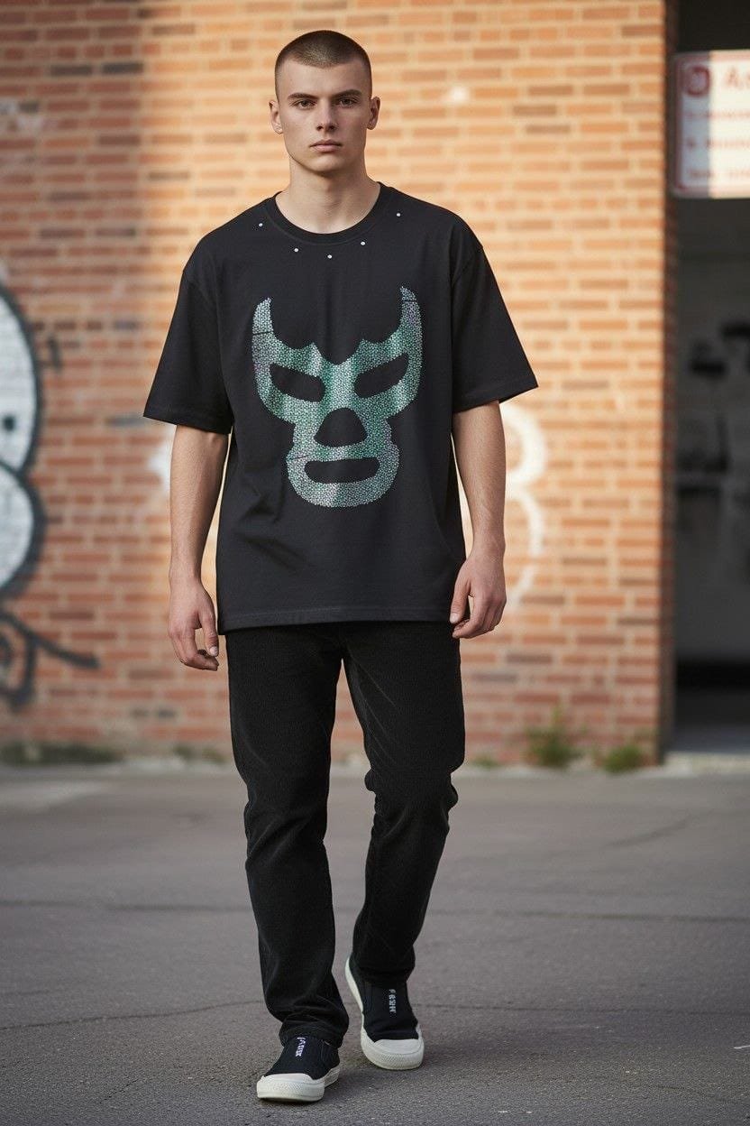 No es solo una playera, es un homenaje a la cultura más vibrante de México. Nuestra playera de Luchador Mexicano reinventa el misticismo de la máscara con un acabado deslumbrante en pedrería fina.