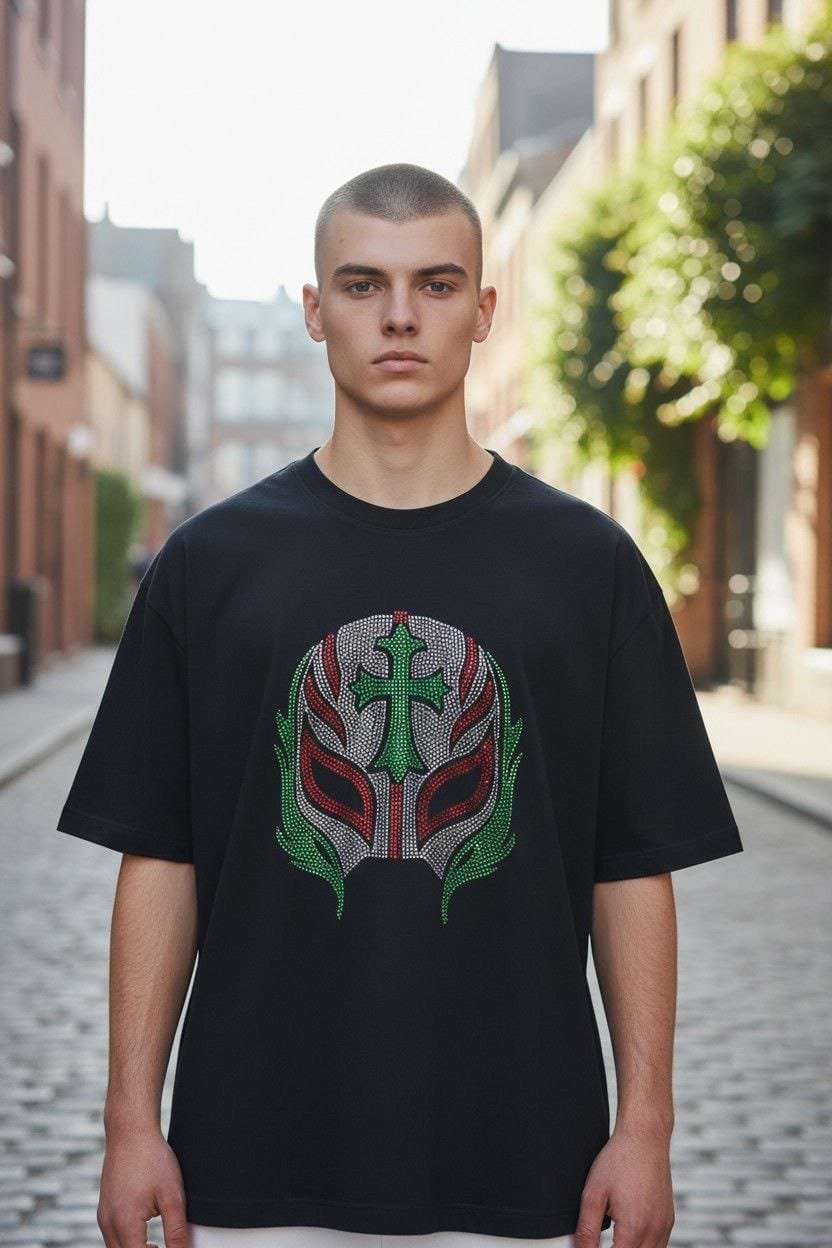 No es solo una playera, es un homenaje a la cultura más vibrante de México. Nuestra playera de Luchador Mexicano reinventa el misticismo de la máscara con un acabado deslumbrante en pedrería fina.
