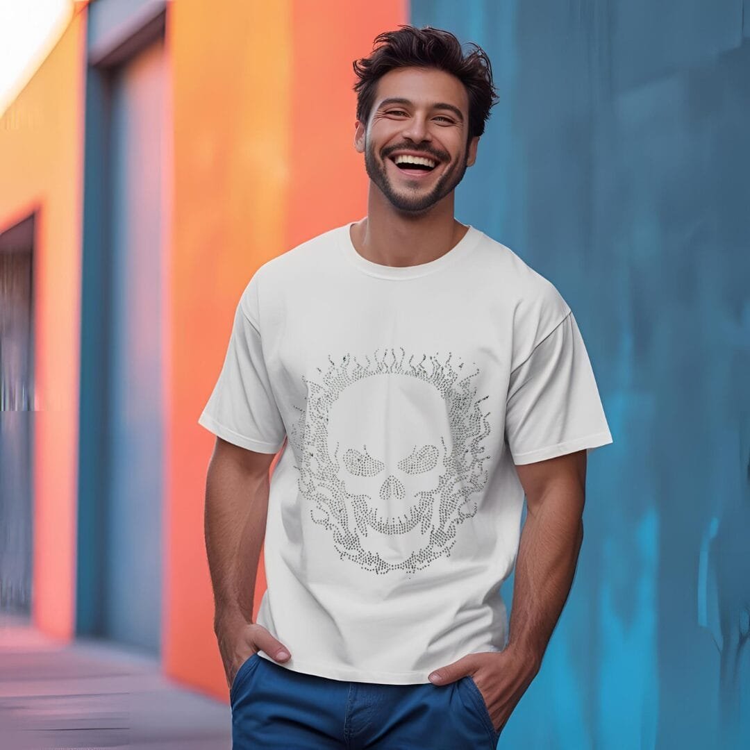 La Playera Corte Regular Unisex Pedrería Brillante Cráneo Llamas es tan versátil como estilizada. Combina perfectamente con jeans, pantalones o incluso shorts, adaptándose a una amplia variedad de ocasiones y looks. La naturaleza unisex del diseño garantiza que cualquiera pueda disfrutar de este impresionante estilo sin esfuerzo. Ya sea que prefieras un look urbano, informal o algo intermedio, esta playera será tu aliada perfecta para resaltar tu personalidad.
