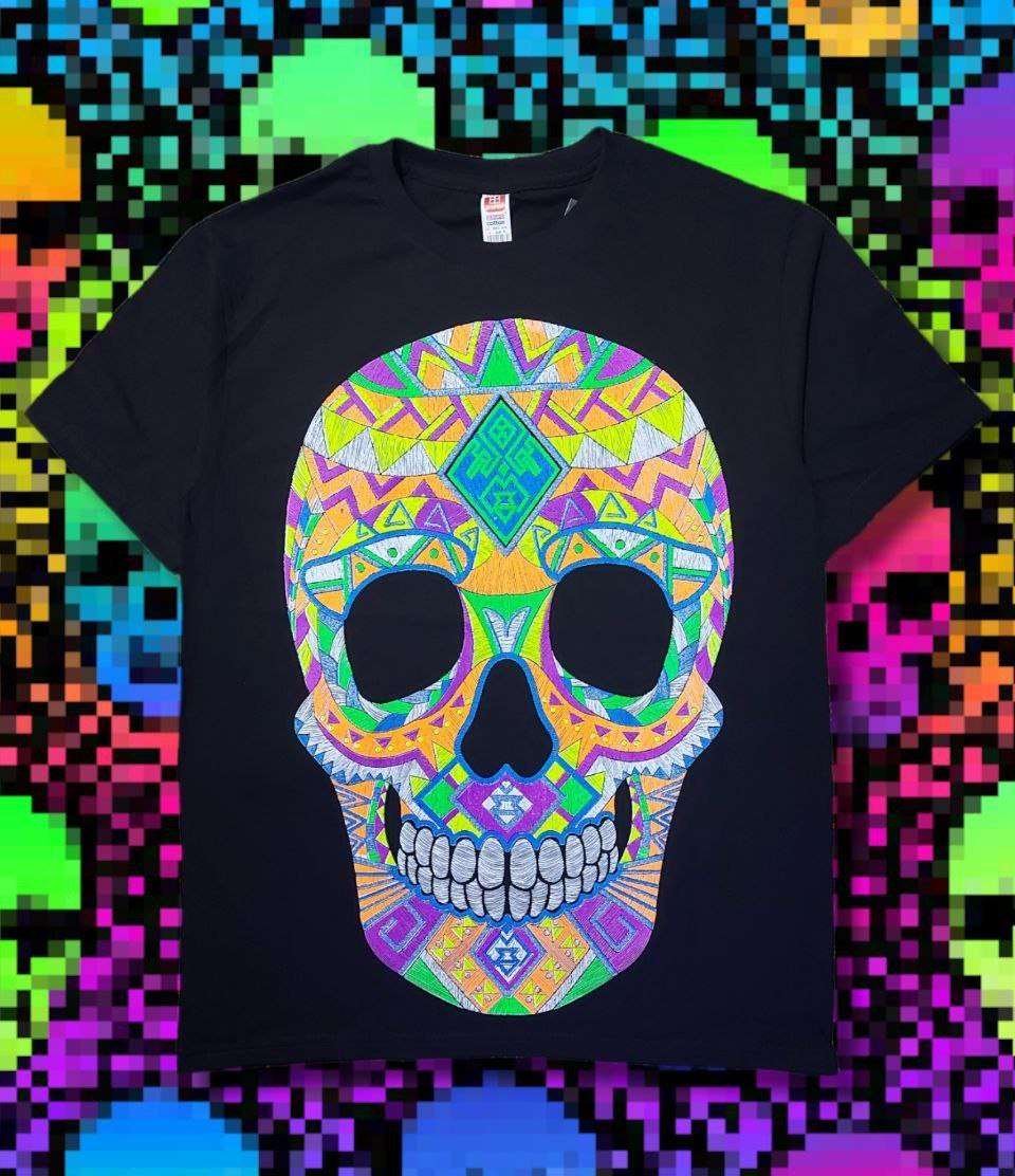 Increíbles playeras Unisex con Serigrafía Neón de cráneos temáticos. Ideales para festejar día de muertos con tus seres queridos.
