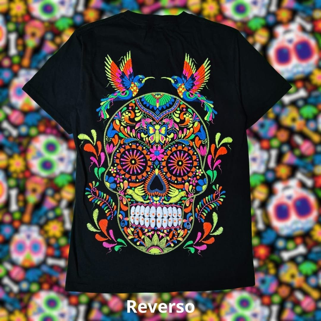 Increíbles playeras Unisex con Serigrafía Neón de cráneos temáticos. Ideales para festejar día de muertos con tus seres queridos.