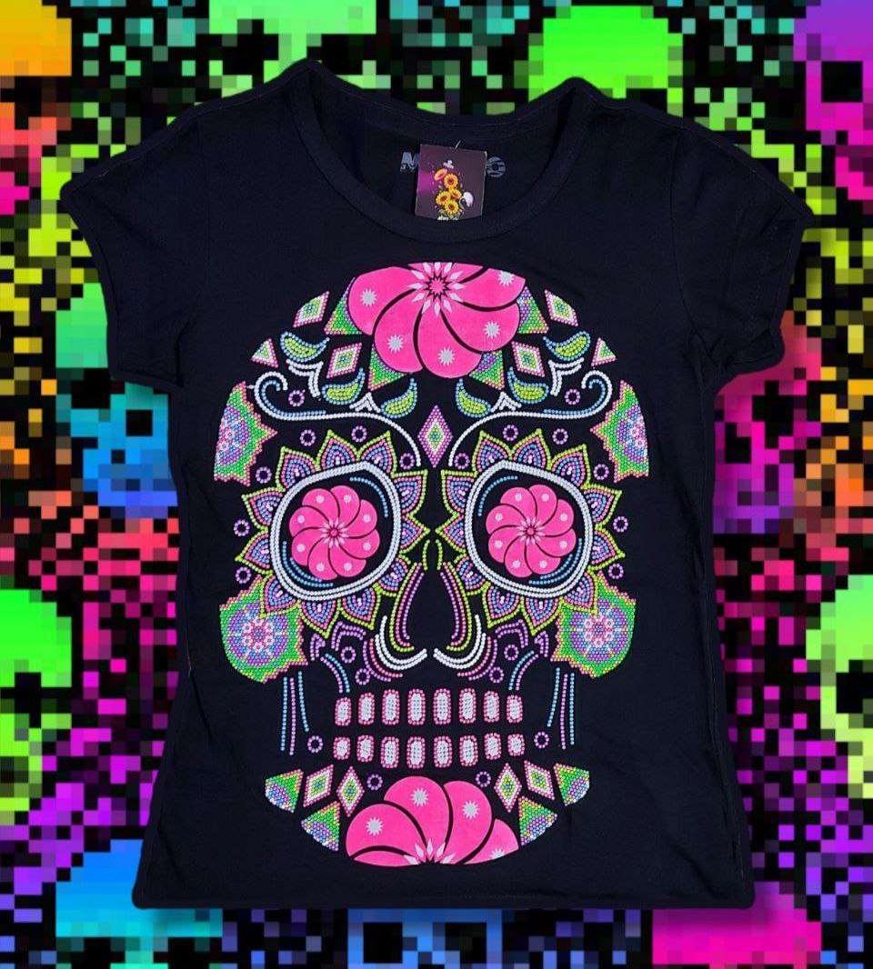 Ir a la TiendaIncreíbles playeras para mujer con Serigrafía Neón de cráneos temáticos. Ideales para festejar día de muertos con tus seres queridos.