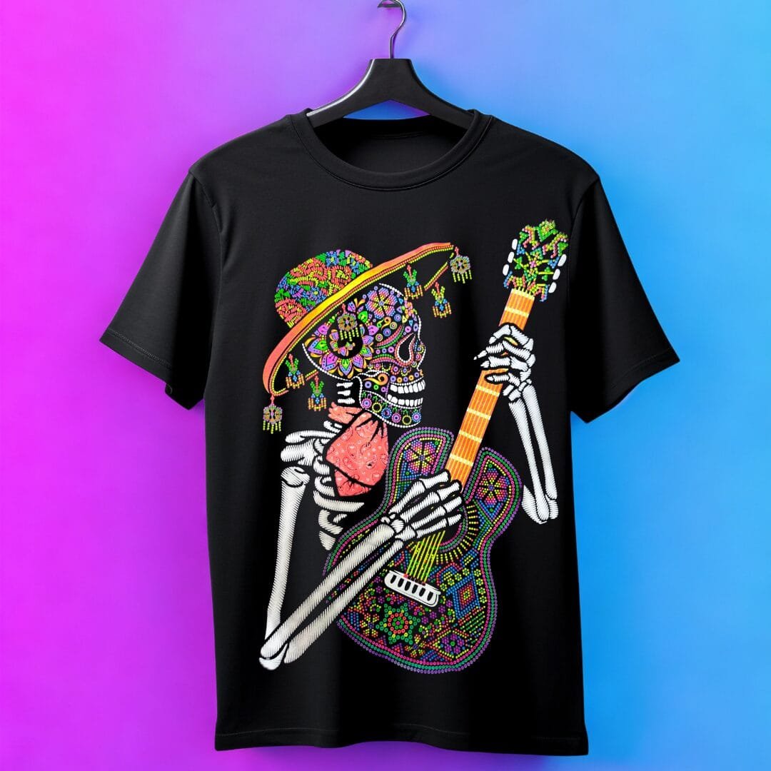 La Playera Cráneo Huichol Guitarra Neón resplandeciente con la luz neón o negra combina arte tradicional con un toque moderno y vibrante. Su llamativo diseño, inspirado en las obras culturales del arte Huichol, presenta un cráneo adornado con patrones coloridos y una guitarra en tonos neón que cobran vida bajo luz ultravioleta o negra. Es la prenda ideal para quien busca destacar y expresar su personalidad única.