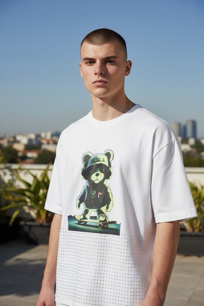 Diseño Protagónico: Estampado frontal de un oso en estilo urbano (estilo toy art o graffiti), cargado de colores neón vibrantes que resaltan bajo cualquier luz.
