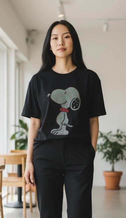 Lleva contigo la nostalgia y el encanto de Snoopy con un diseño elevado. Esta prenda no es la típica playera de algodón; su acabado con aplicaciones brillantes la convierte en una pieza clave para un look casual chic.