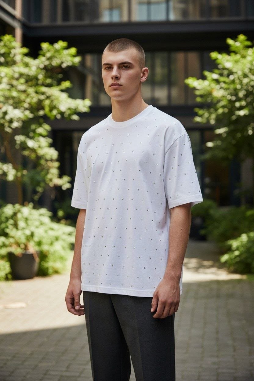Eleva tu estilo urbano a un nivel superior con nuestra playera Oversize Full Pedrería en color negro. Esta pieza no es solo una prenda básica, es una declaración de lujo contemporáneo diseñada para quienes no temen destacar.
