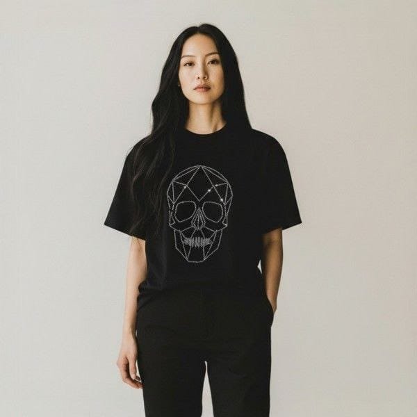 Lleva el diseño contemporáneo a otro nivel con esta playera que fusiona el misticismo de la calavera con la precisión de la geometría. Es la pieza perfecta para quienes buscan un look rebelde pero con un acabado sofisticado y brillante.