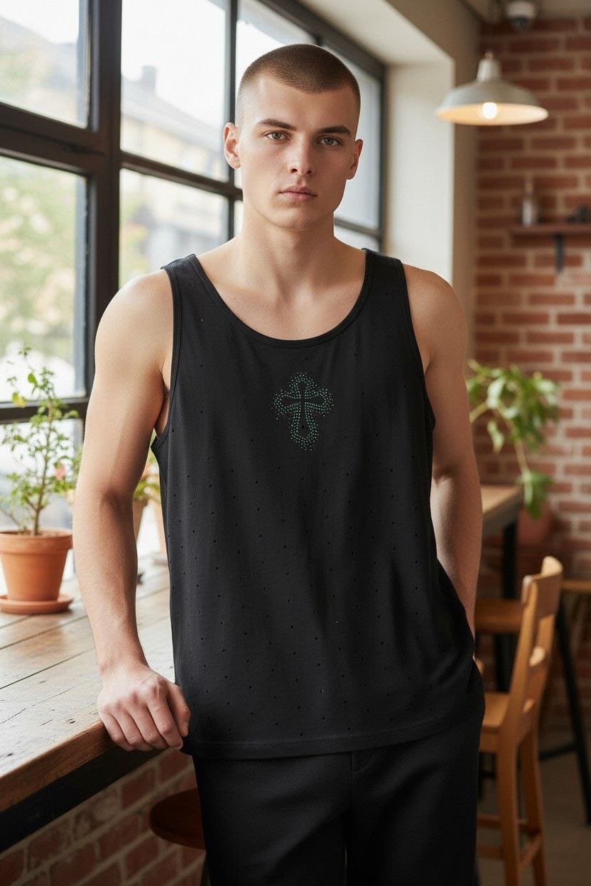 Define tu presencia con esta Tank Top de corte ajustado. Una prenda versátil que transita entre el athleisure de lujo y el estilo nocturno más audaz.