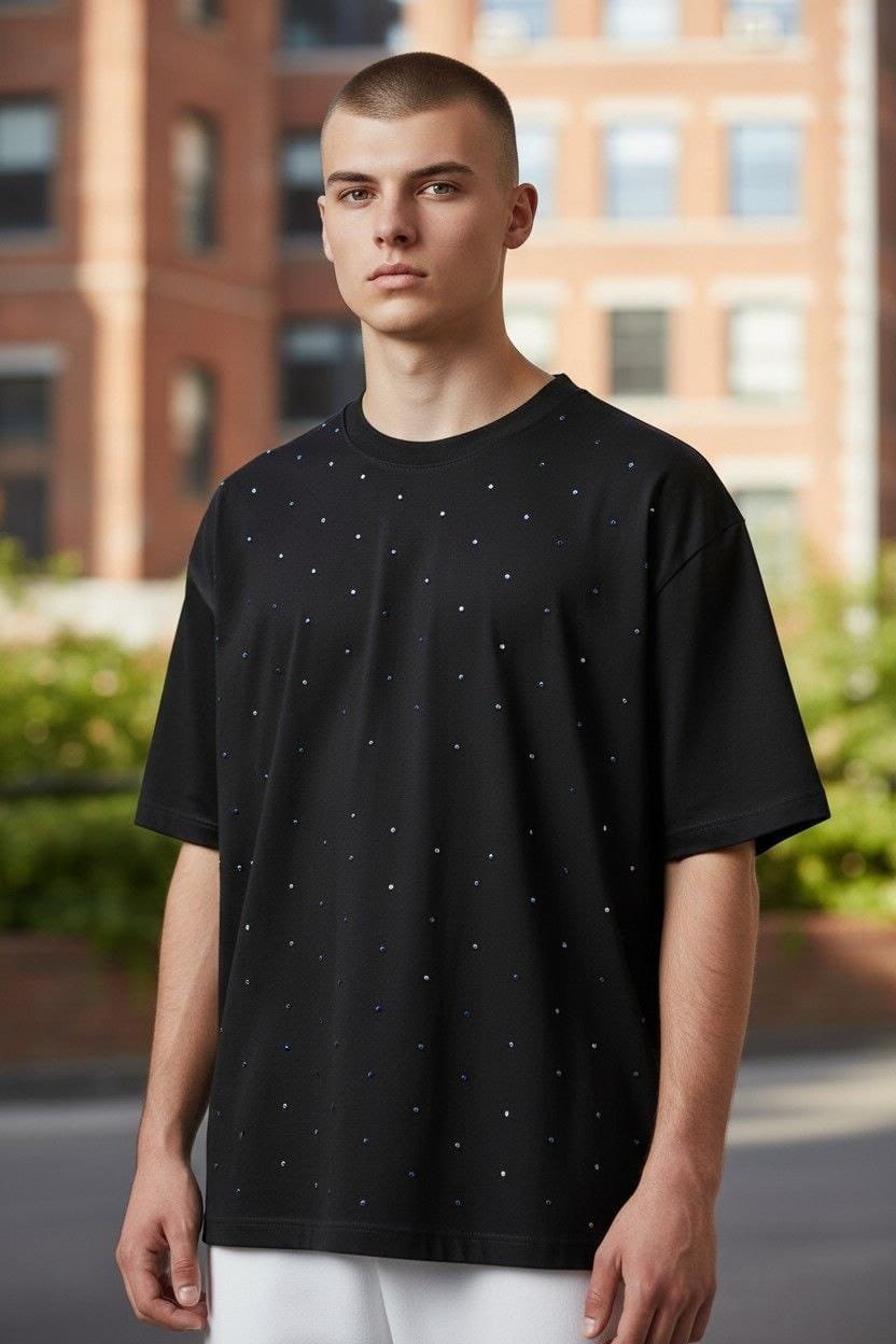 Frente: Presenta un diseño exclusivo en pedrería azul de alta densidad. El brillo de los cristales aporta una textura tridimensional que captura la luz con cada movimiento, elevando la clásica playera a una pieza de declaración.