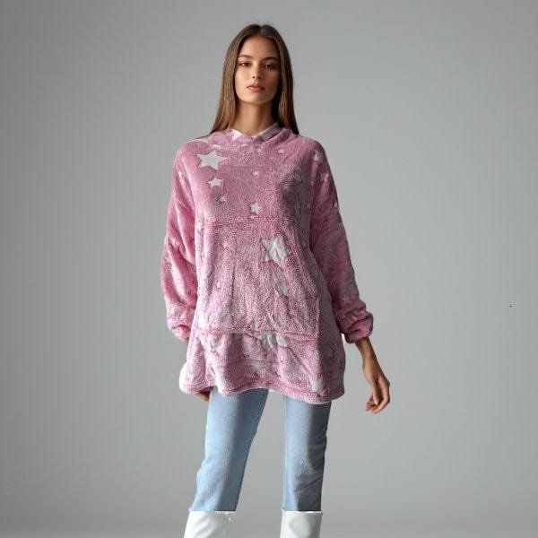 Está confeccionada con tejido tipo borrega de tacto ultra suave, ideal para sentirte calientita y relajada en todo momento. Los detalles como los puños elásticos en rosa pastel, la amplia bolsa canguro frontal y la capucha hacen que sea práctica y acogedora a la vez.