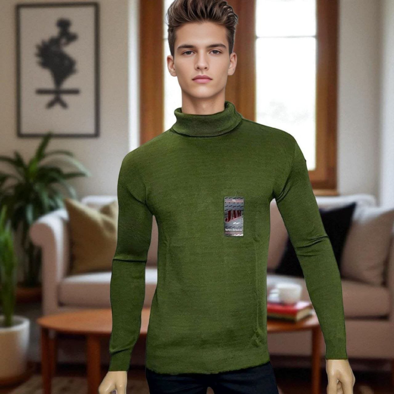 Su diseño con cuello alto añade un aire sofisticado, perfecto para combinar tanto con jeans como con pantalones de vestir. Las mangas largas entalladas y el corte slim fit realzan la figura masculina, haciéndolo ideal para ocasiones casuales o semi-formales.