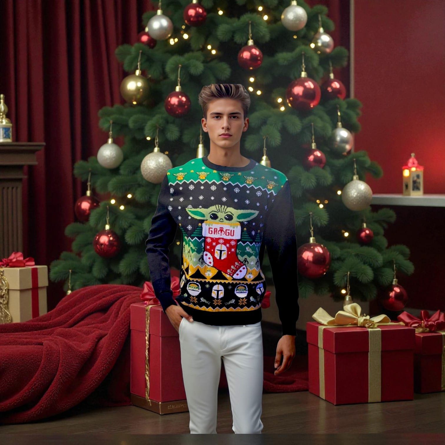 Creado para ser verdaderamente unisex, el Suéter de Navidad Ugly Baby Yoda está diseñado para adaptarse cómodamente a cualquier figura. Su tela de alta calidad ofrece una combinación perfecta de calidez y suavidad, haciendo que sea práctico y confortable para usar durante horas. Con detalles vibrantes del querido personaje Baby Yoda, este suéter no solo es un homenaje al universo de Star Wars, sino también una prenda que destaca por su estilo y personalidad.