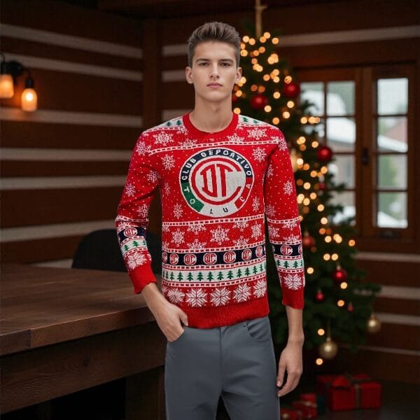 Fabricado con materiales de alta calidad, el suéter garantiza calidez y durabilidad. Está diseñado para ser cómodo tanto en interiores como en exteriores, gracias a su ajuste versátil y su textura suave. Los colores vibrantes y los detalles del equipo Toluca están meticulosamente integrados, asegurando que el diseño permanezca intacto y llamativo incluso con uso frecuente. Este suéter es más que una prenda; es un símbolo de entusiasmo tanto por la Navidad como por el deporte.