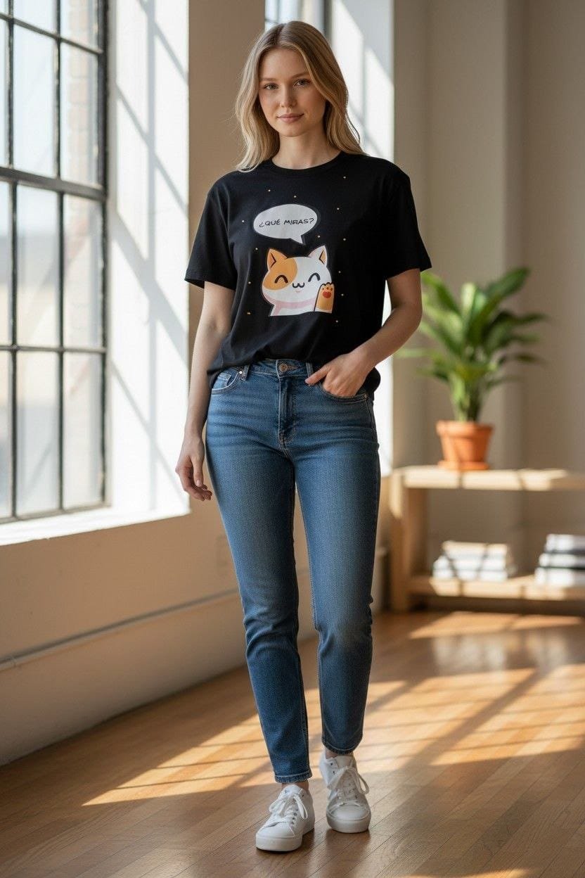 Gráfico con Actitud: Presenta un diseño frontal de un Gatito con expresión audaz y la frase «¿Qué miras?», combinando una estética cute con el lenguaje directo del streetwear neoyorquino.