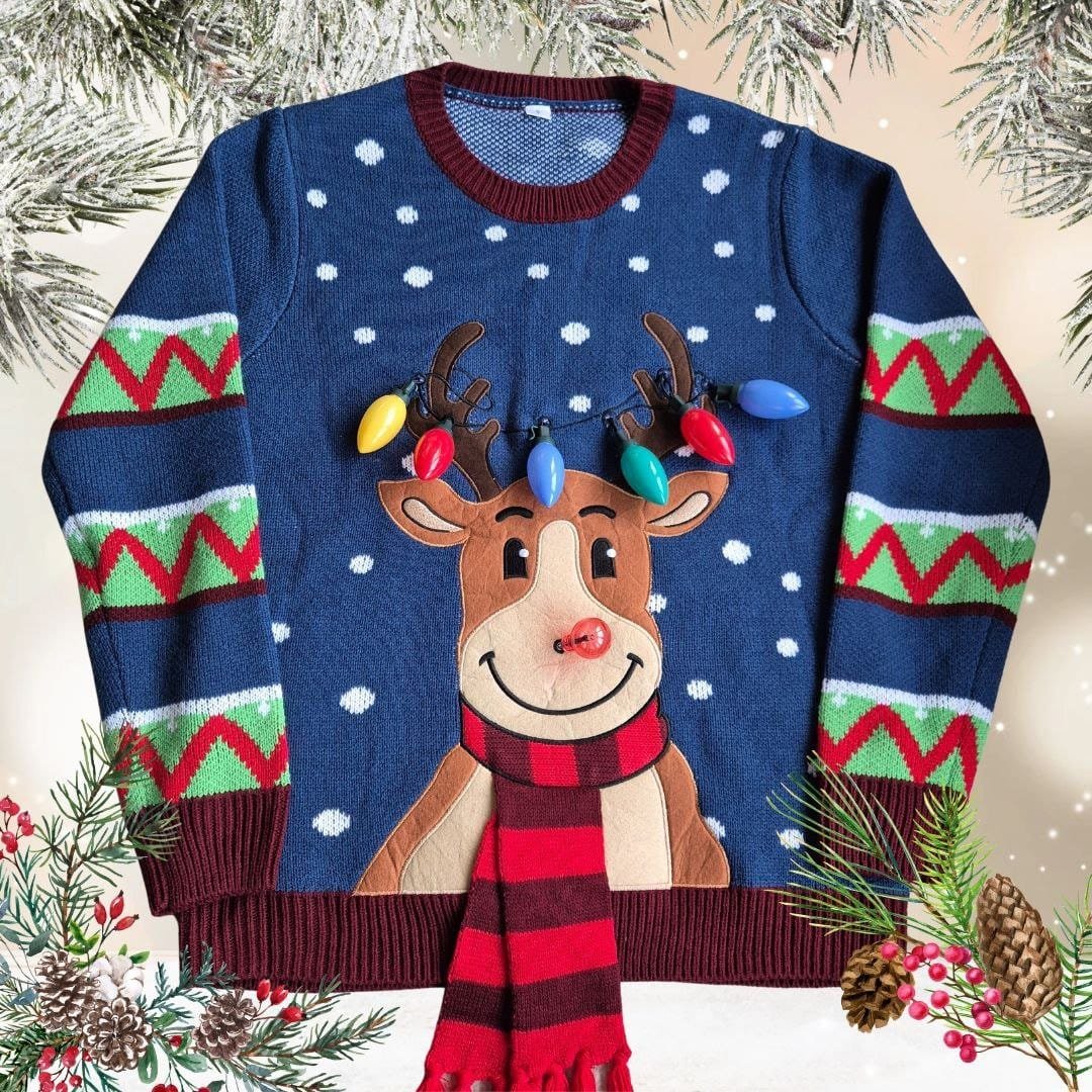 Ugly Sueter Navideño tejido confeccionado en acrilán algodón ideal para festejar las fiestas decembrinas con focos de luz ,baterias incluidas.